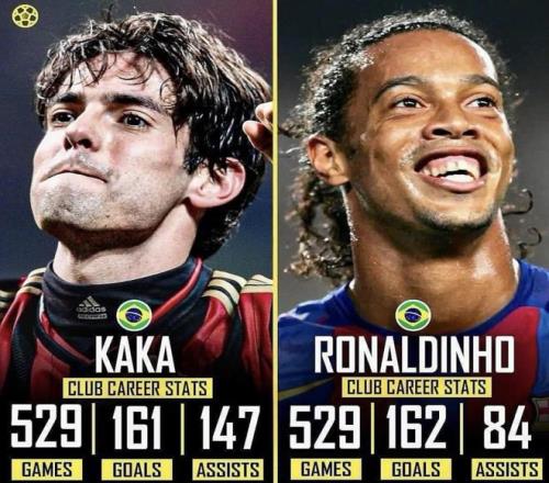 卡卡場(chǎng)均G+A為0.58,明顯高于羅納爾迪尼奧的0.47;助攻147比84占優(yōu),進(jìn)球基本持平(161vs162)。