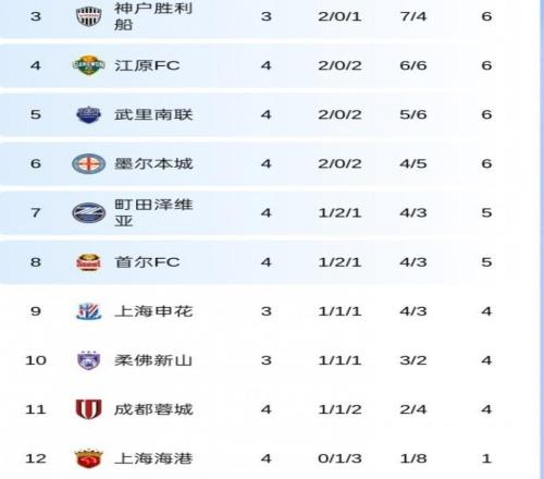 亞冠精英聯(lián)賽東亞區(qū) 4 場(chǎng)戰(zhàn)罷,目前海港隊(duì) 4 戰(zhàn) 1 分積分墊底,成都蓉城隊(duì) 4 戰(zhàn) 2 分排名倒數(shù)第二,少賽一場(chǎng)的上海申花隊(duì)暫列第九。